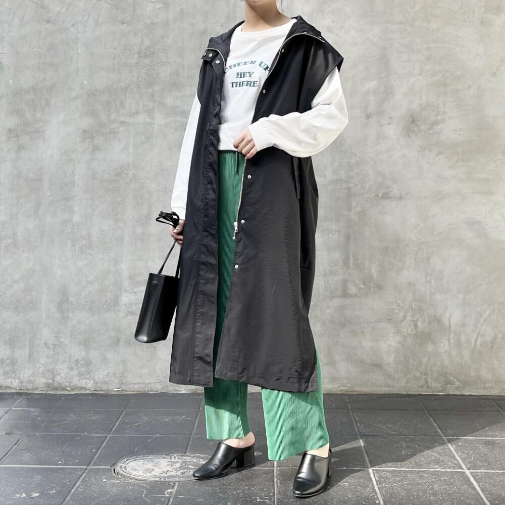 縦のラインを強調するロング丈で、すっきりとした印象に仕上げながら気になる体型もさりげなくカバー◎